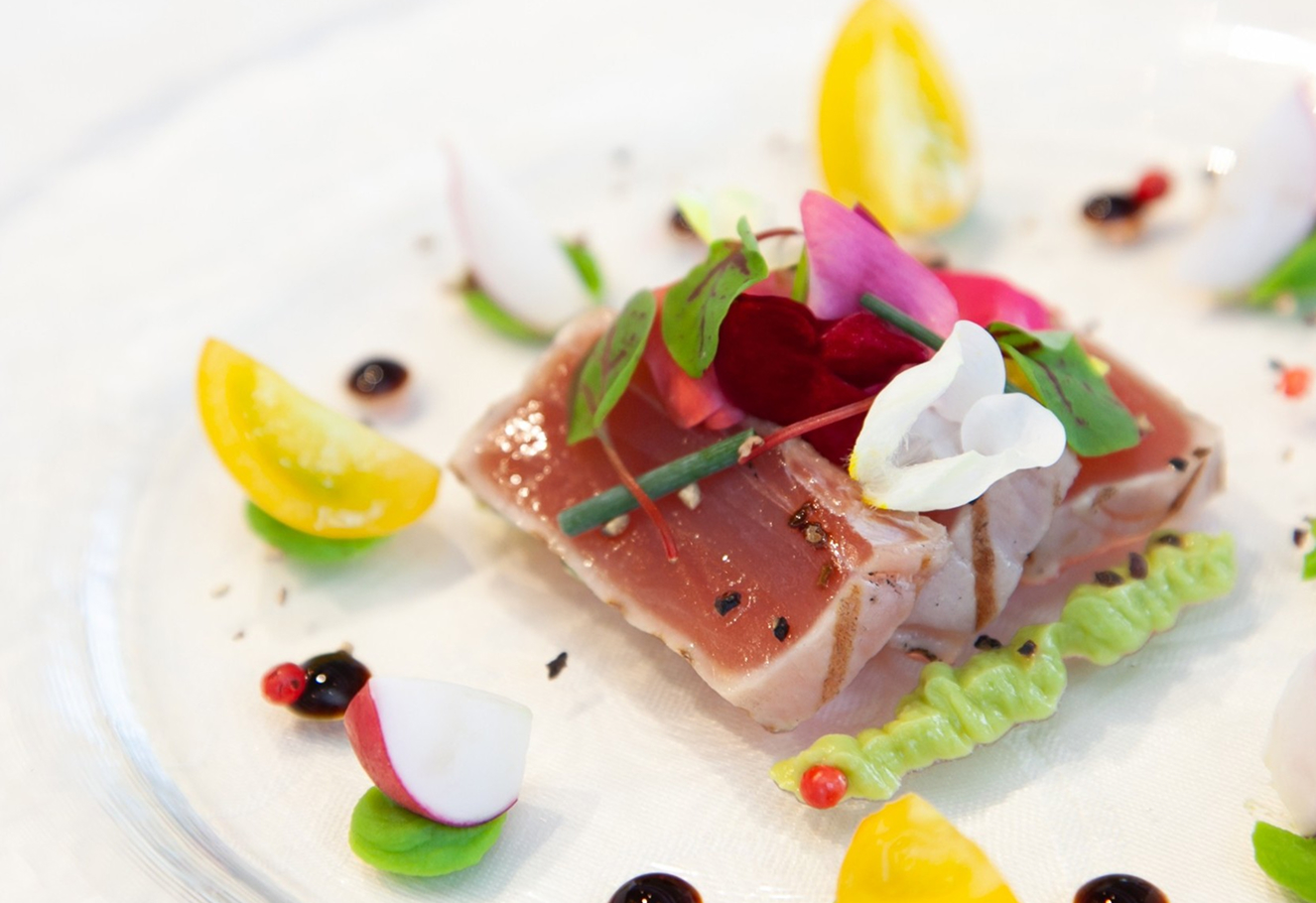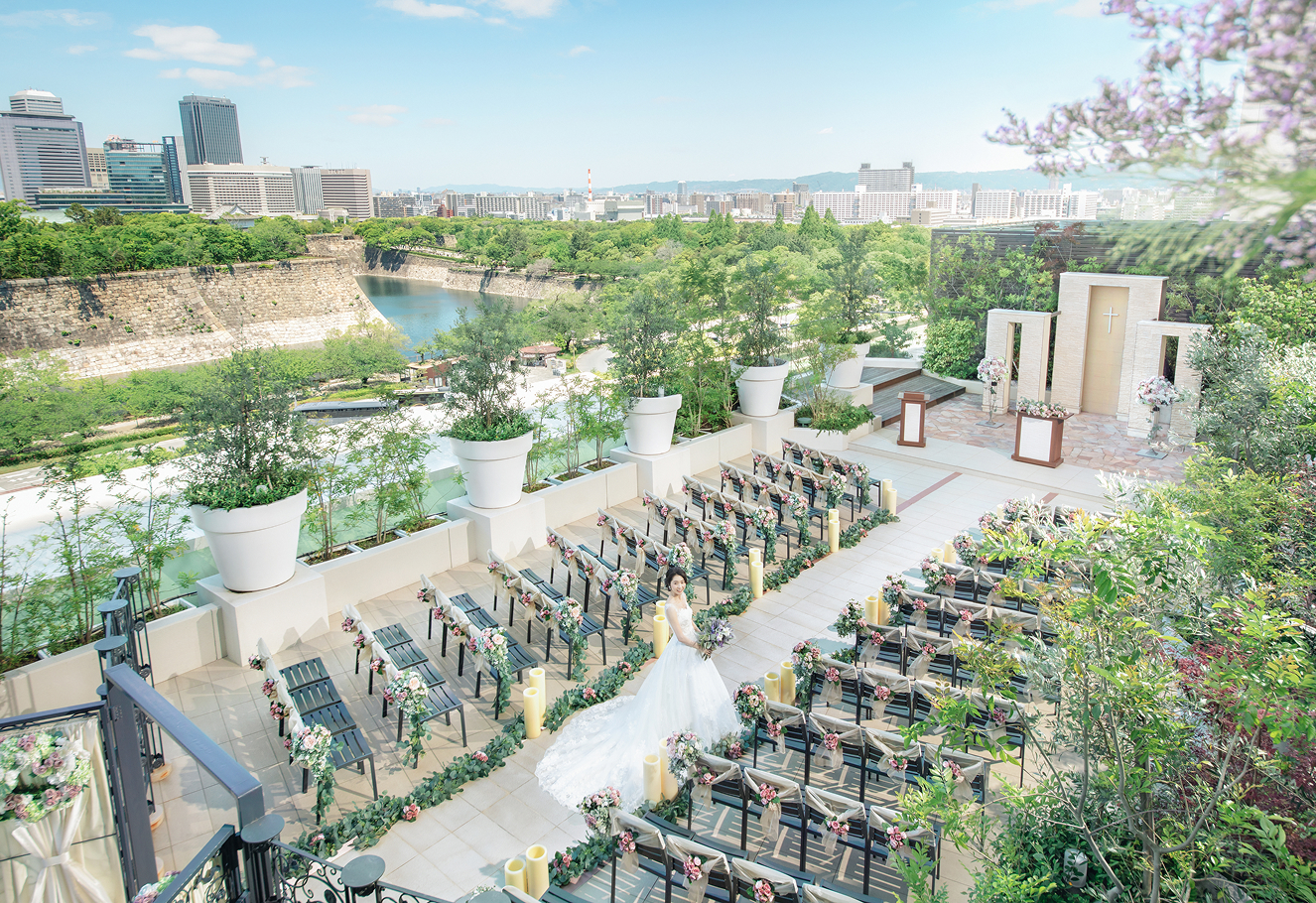 優しい自然光に導かれながら、白い大理石のバージンロードを花嫁が進むシーンは素敵。大きな窓から見える四季折々の景色とともに記憶に残る挙式は、その季節が来るたび、結婚式の日を思い出す。